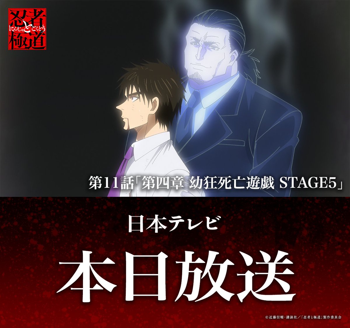 @ningoku_anime◤━━━━━━◥ BS日テレにて 本日放送!!! ◣━━━━━━◢ TVアニメ『忍者と極道』 BS日テレにて本日第11話放送!!! 第11話「第四章 幼狂死亡遊戯 STAGE5」 BS日テレ:24時00分〜放送 「なあん☆ちってェ」 #忍者と極道 pic.x.com/sPMIEM2jIE