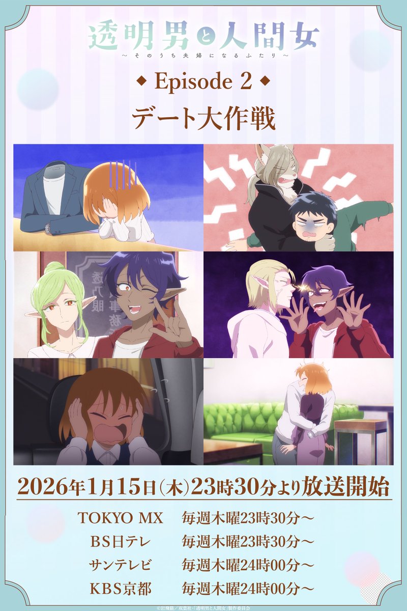 @BS4anime📣おしらせ📣 本日23:30から「透明男と人間女~そのうち夫婦になるふたり~」放送! 第2話 「デート大作戦」 あらすじはこちら bs4.jp/tomeiotoko-nin… #透明男と人間女 #BS日テレ pic.x.com/lb6L5SUgg9