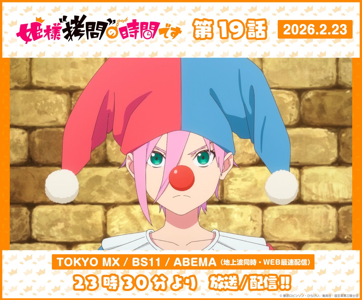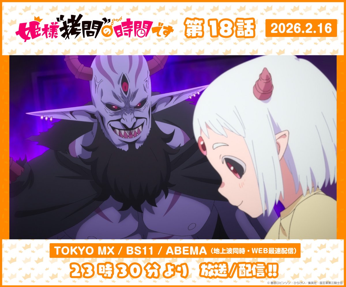 @ATX_PR2/24(火)23:30から 『姫様“拷問”の時間です 第2期』第19話 AT-Xで放送! <キャスト> 白石晴香 小林親弘 伊藤静 永瀬アンナ 井上ほの花 山根綺 茅野愛衣 日高里菜 中原麻衣 千本木彩花 富田美憂 福島潤 ほか 🛰番組情報 at-x.com/program/detail… #ひめごう #姫様拷問の時間です #at_x
