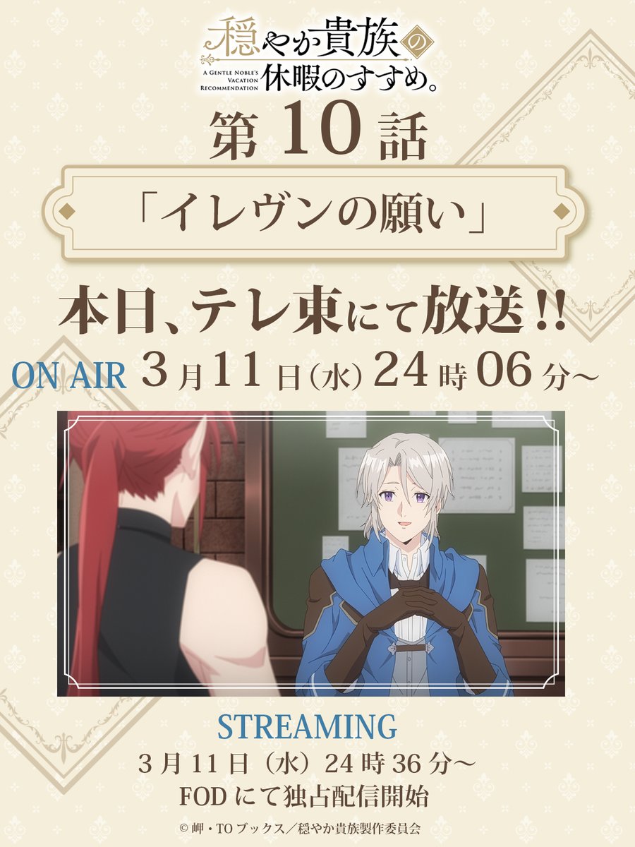 @odayaka_pr◇════◇════◇ 👑\ #穏やか貴族/⚔ ☕第10話本日放送‼📜 ◇════◇════◇ TVアニメ『穏やか貴族の休暇のすすめ。』 第10話は本日放送☕ 📖第10話「イレヴンの願い」 odayakakizoku-pr.com/story/ 👇放送&配信情報 テレ東▶3月11日(水)24時06分~ FOD▶3月11日(水)24時36分〜 pic.x.com/cDNZKNJGbi
