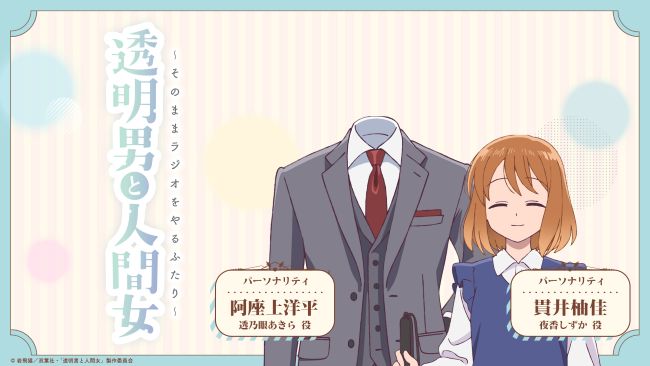@tomeiotoko/ #透明男と人間女 公式ラジオ第🔟回配信開始!📢 \ 本日第10話放送の、TVアニメ『#透明男と人間女』の公式ラジオ「透明男と人間女〜そのままラジオをやるふたり〜」第🔟回が配信開始されました!🎉 今回は、透乃眼あきら役 #阿座上洋平 さんと、夜香しずか役 #貫井柚佳 pic.x.com/ahJbTBEQtg