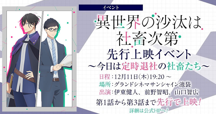 @ATX_PR3/24(火)23:00から 『異世界の沙汰は社畜次第』第12話 AT-Xで【最速】放送! <キャスト> 伊東健人 前野智昭 山下誠一郎 東地宏樹 山口智広 鎌倉有那 虎島貴明 虎島貴明 小野友樹 森崎ウィン 興津和幸 井澤詩織 🛰番組情報 at-x.com/program/detail… #異世界の沙汰は社畜次第 #いせしゃち #at_x