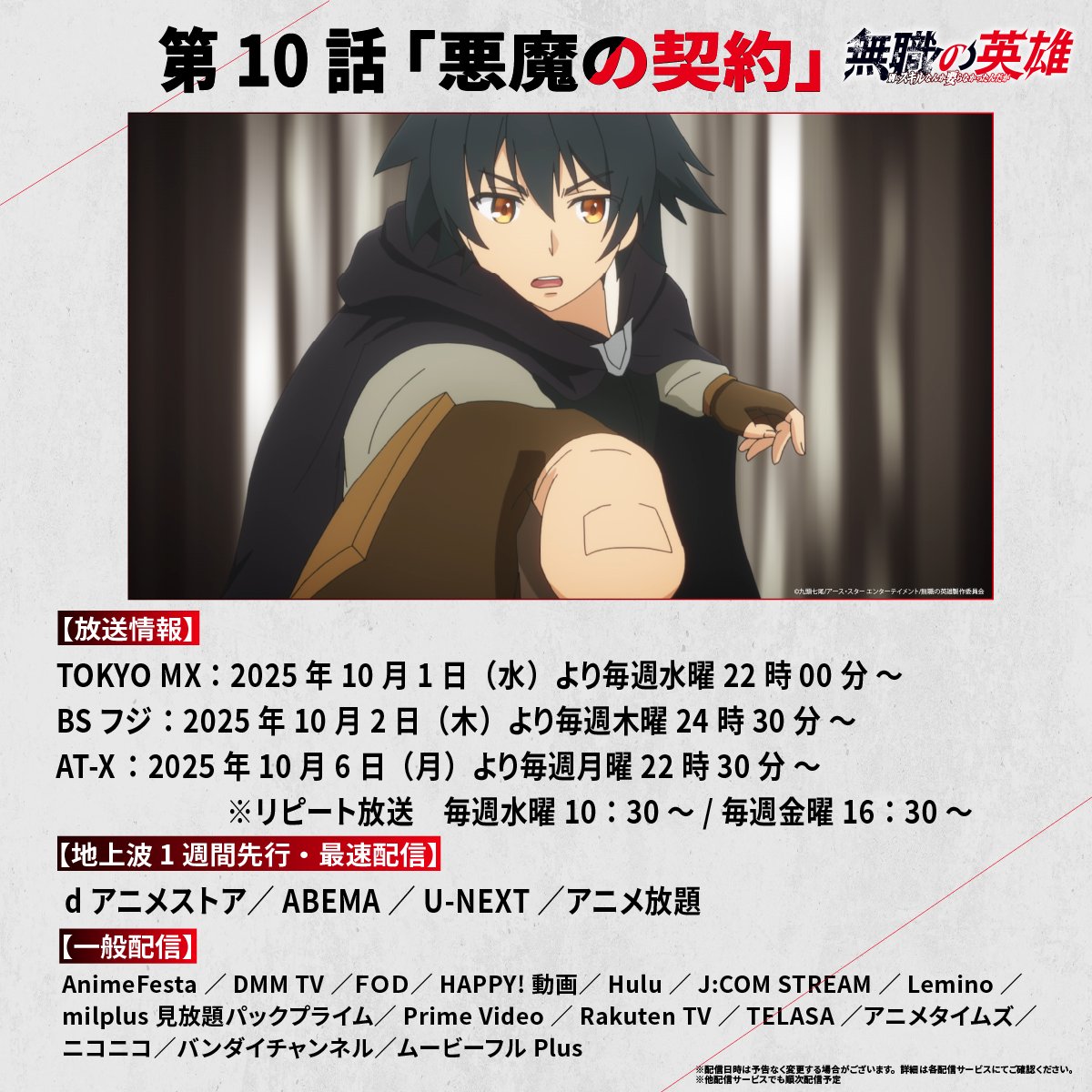 @mushoku_eiyu#無職の英雄 本日の放送情報  ̄V ̄ ̄ ̄ ̄ ̄ ̄ ̄ ̄ ̄ ̄ ̄ 🪄第10話「悪魔の契約」🪄 BSフジにて、 本日12月4日(木)24時30分~ 放送開始📺 放送をお楽しみに👀 pic.x.com/Qb9kpjs6U6